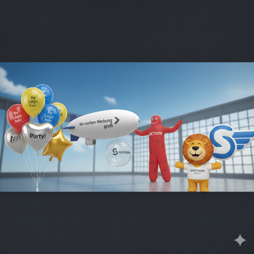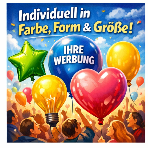 Als Werbeballons aus Latex mit Aufdruck eignen sie sich ideal für Unternehmen, Vereine und Promotionaktionen mit größeren Stückzahlen. Folienballons mit Aufdruck bieten sowohl für B2C-Kunden individuelle Einzelstücke mit Wunschfoto als auch für B2B-Kunden hochwertige Lösungen mit Logo und Markenmotiv. Bedruckte Ballons schaffen hohe Sichtbarkeit und einen starken Wiedererkennungswert auf Messen, Events und am Point of Sale. Ergänzend realisieren wir Großdisplays in individueller Anfertigung wie Zeppeline, Crowdbälle oder Skydancer mit individuellem Print. Ob Dekoration, Werbegeschenk oder Fernwirkung – Ballons sind vielseitig einsetzbare Werbeträger mit emotionaler Wirkung.